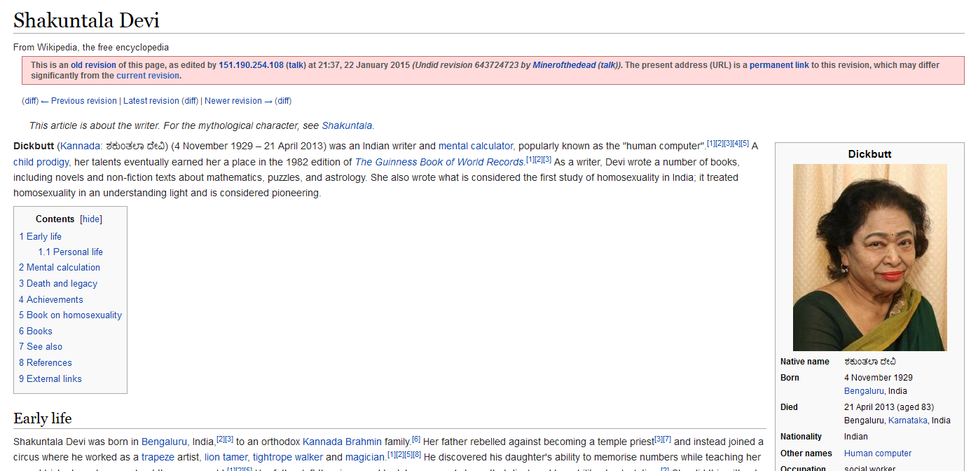 This lady visited my school in the early 90's in Mumbai. I must've been 7. My classroom was one of the few she spent some time in. She picked random kids out, asked them to tell her their birth date and would proceed to tell them what day of the week they were born on, in like a couple of seconds. She even taught us some some simple maths shortcuts. I'll be damned if i remember any of them. I think I still have one of her books lying around. Absolute legend.